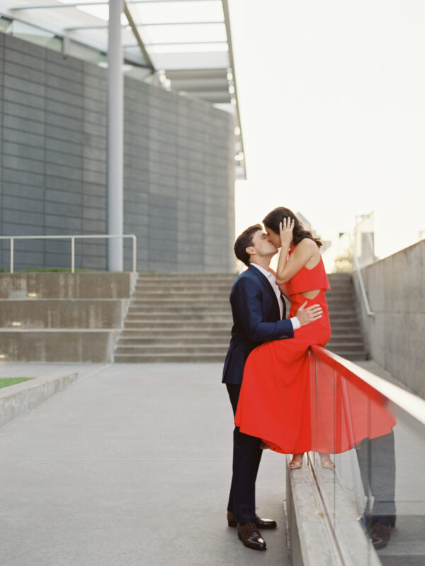 To Terésa, the proposal could not have been more of a surprise. Rowan was not being one hundred percent honest when he told Terésa he “had plans” to watch the Cowboys vs. Packers playoff game with his friends. Meanwhile, Terésa had made her own plans: she was off to a new member meeting at the Nasher Sculpture Center with Rowan’s mom. When she and his mom arrived at the Nasher, Terésa didn’t suspect a thing when they were instructed to go downstairs to the projection room. Confusion set in as Rowan’s mom began to leave the room, and a movie started to play on the projector. It was a slideshow of photographs of Rowan and Terésa, throughout the years. Moments later, Rowan walked in from the back of the room with flowers and a smile. When the movie was over, Rowan asked Terésa to follow him outside. There, in the back garden filled with string lights, flowers, and champagne, he got down on one knee.