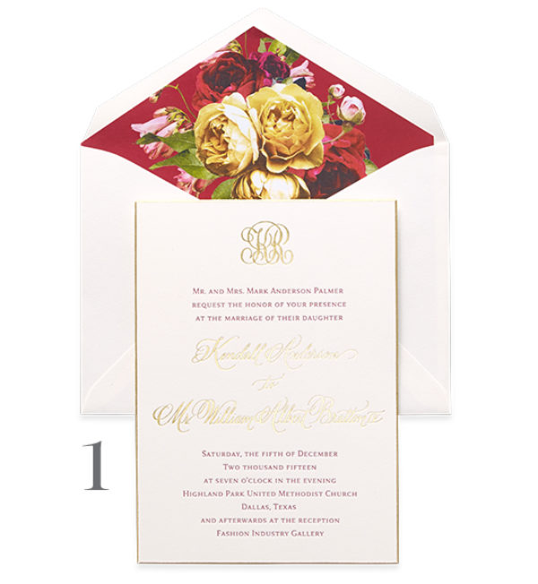 Cranberry letterpress with gold foil accents and gold beveled edge and custom floral envelope liner