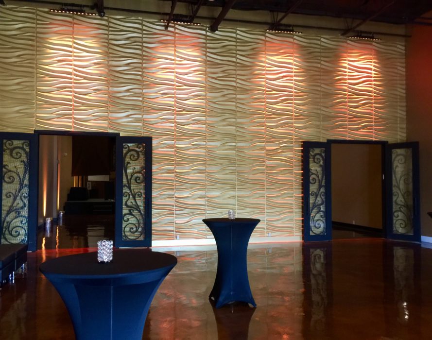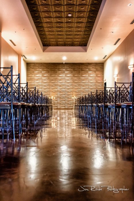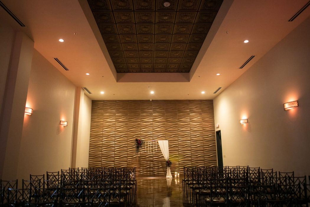 Vouv Event Space, the contemporary and self-described “industrial chic” venue in Farmers Branch, boasts an expansive lobby, central ballroom, and chapel room washed in sometimes metallic, neutral tones. Flexible layouts are available for the couple who want to curate their ideal wedding experience. All food and drink is provided by exclusive caterer Culinary Art Catering.