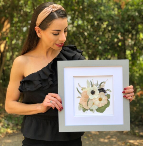 Andrea Castaneda first learned the art of pressing florals from her boyfriend Justin’s grandmother. Then on Valentine’s Day 2016, after Justin gave her a bouquet of flowers, Castaneda created her first solo design, pressing them into a frame. And thus, Designs by Andrea was born.