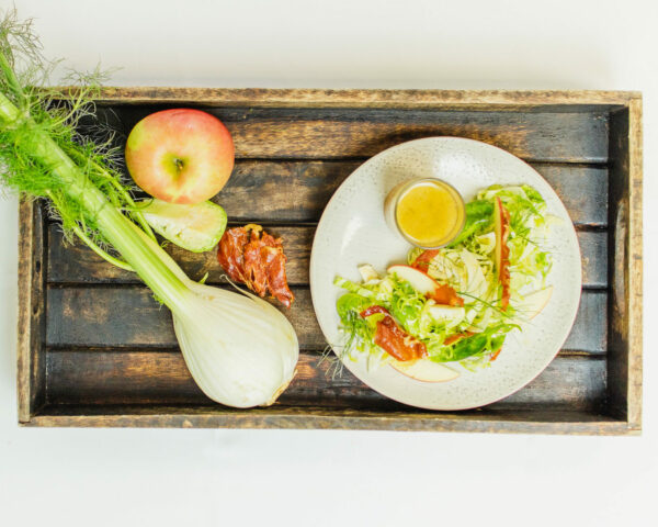 Salad of Shaved Brussels, Fennel, and Apple Salad with Maple Citrus Vinaigrette and Crispy Prosciutto