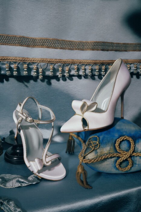 Indeed, her bridal collection includes many with grass- and gravel-friendly heels, such as the Perfect Block Sandal—available in white and gold leather, with 30, 60, or 90mm heel heights. Prefer something low? Try the Natalie flat, available in a sling or closed-back style. Or dare to wear the Perfect Pump, offered in a variety of colors and materials, in as high as a 100mm stiletto. (Interestingly, Flint notes, heels have once again surpassed flats in sales, something she wasn’t sure she’d ever seen again following the Covid-led shift toward remote working.) Many of the white styles include a blue instep—the perfect touch of something blue.