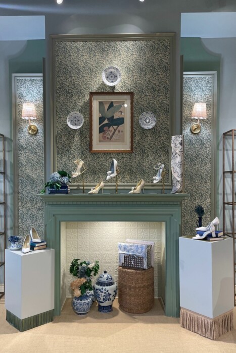 “With so many luxury stores, you go in and it’s beautiful, and it feels very rich, but it also can feel a little cold. And there’s often a guy with a suit at the door, and that can feel a little intimidating,” says Flint, who eschewed stark and slick fixtures in favor of chintz fabrics, intricate moldings and fringe trims, and designer lighting (complete with a ceiling medallion). William Morris wallpaper lines the walls, and Royal Copenhagen china hangs above a pair of mantels, which are accented with boxwood topiaries and dried hydrangea stems. Upon entering, you’re offered tea and encouraged to make yourself at home on one of the plush sofas. And though the sales associates are warm and helpful, should they ever be busy helping another customer, you’re invited to grab a size from the try-on wall along the back of the store.