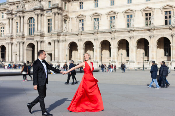 Norah describes their engagement as a complete fairytale, and it certainly helps that it was set in the city of love. The couple went to Paris for a friend’s wedding and decided to make a long trip out of it. They shopped, ate, and toured their way through city. On the night of the proposal, they ate dinner at Le Cafe Marley at the Louvre and afterwards headed out for a stroll. As they walked by the iconic glass pyramids, Steven stopped, pulled out a custom hand-painted Louis Vuitton ring trunk, and asked Norah to marry him. He had also secretly booked the photographer from his friend’s wedding to capture the special moment.