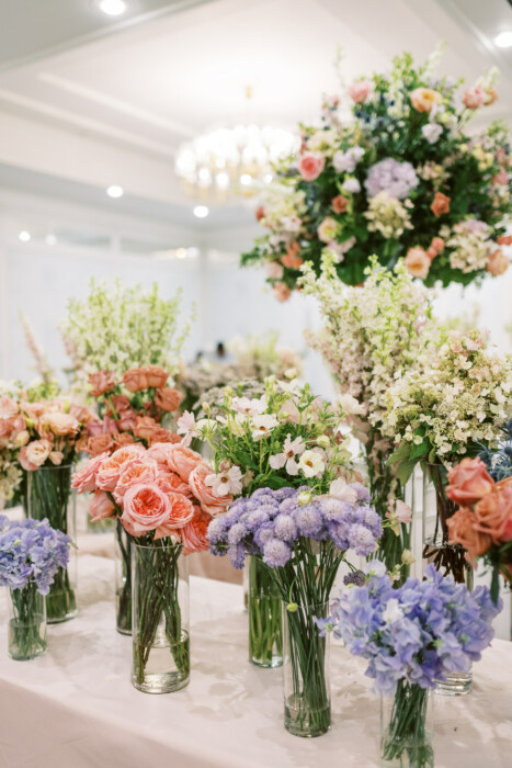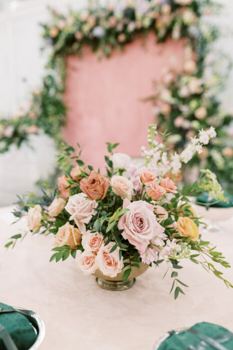 2. Big flowers second. Go in next with your larger, statement blooms, (think: peonies, garden roses, ranunculus, etc.) and evenly space them out to be seen from each side of the arrangement. “You also want to remember that table arrangements are seen from the top and at eye level,” says Taylor. “So, keep in mind all angles when arranging.”