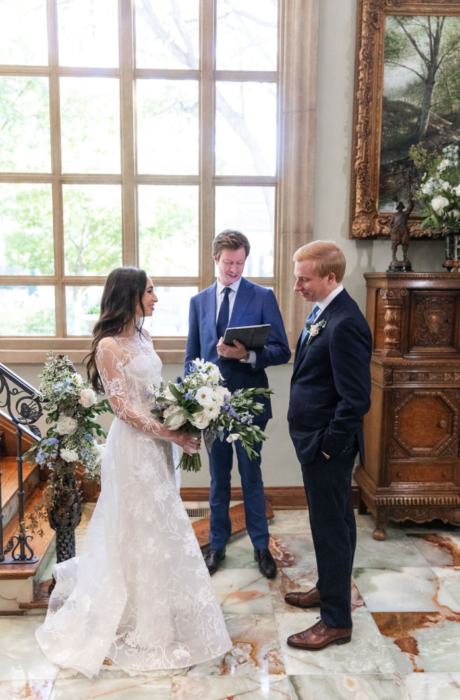 This simple ceremony in the foyer of the groom Brian's family home created a deeply personal moment that can be shared with the people they love in a space that's special to the couple.