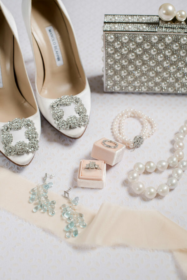 She worked to incorporate things she loves from different artists, individuals, and brands—from artist and bridesmaid Taelor Fisher’s pillows at the reception to Emily McCarthy’s monogram design. The bride herself designed the pieces that each bridesmaid wore in her hair, as well as their earrings and necklaces. The bride, her mother, and her flower girl all wore pieces from Hazen & Co.’s bridal line, which launched the week after the wedding.