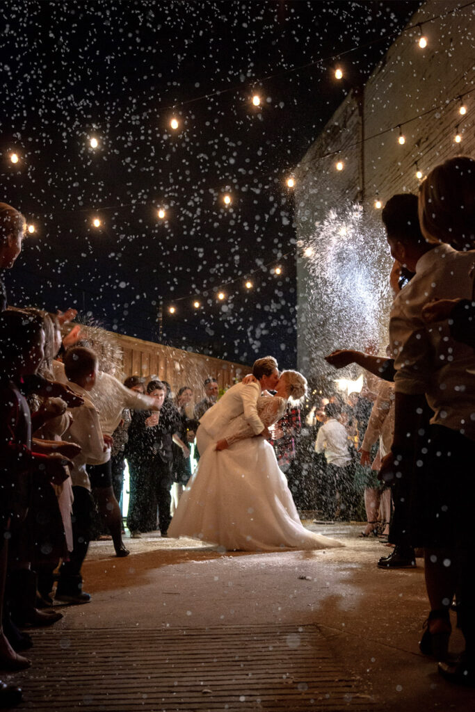 While a sparkler sendoff lends an undeniably gorgeous holiday glow to your exit photos, some venues don’t allow the firework favorites. Instead, end the night with an especially festive grand finale. “We love using ‘eco snow’ for exits,” says planner Crystal Frasier of Crystal Frasier Events, referring to faux snowflakes that are fully bio-degradable and therefore environmentally friendly. “Your photos will be magical with the look of snow falling as you and your partner exit to the departure car.”