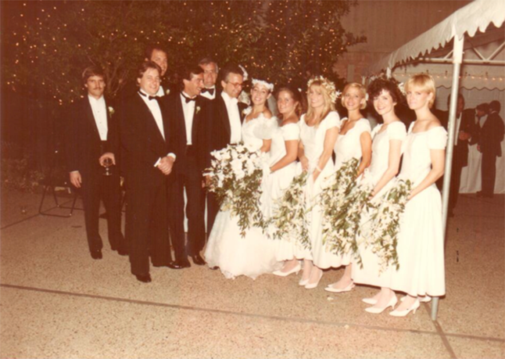 Their approach was European, but the wedding was grand and magical in a way only a Dallas wedding could be. Michelle envisioned a “white wonderland,” which hadn’t yet been done at the time. “There were twinkle lights in all of the trees and thousands of orchids going down the creek bed,” she remembers. The flowers and décor were arranged by Kendall Bailey with help from Michelle’s friend and fellow interior designer, Stephen Sills. “My mother had planted white caladiums everywhere that year and Kendall sprinkled his fairy dust over them.” All of the bridesmaids wore white, too, with customized floral headpieces to match.