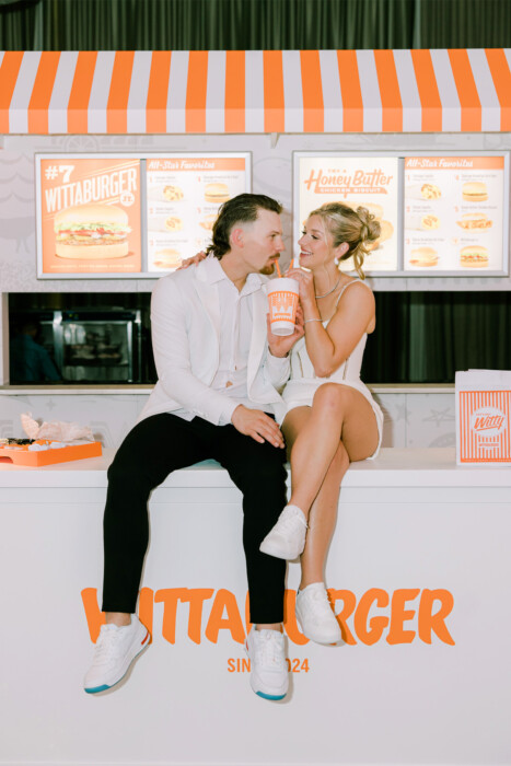 Planner Leslie Ochs is known for her larger-than-life concepts (see #25 on this list). But her idea to recreate a Whataburger—dubbed Wittaburger for the occasion—inside Maggie and Bobby’s reception space may be one of her most memorable. Helping grease the wheels was the fact that Bobby is a national brand ambassador for the Texas-based chain, whose leadership happily gave their blessing and worked with Leslie and Bobby’s marketing agency, Hustle Sports Group, to bring it to life. “They loved the idea,” says Leslie. Then came the tiny task of figuring out how to build it. Because the install would take place mid-reception in the flipped ceremony space, construction couldn’t involve noisy hammers or power drills. Making the need for stealthiness even more important was the fact that the whole thing was a surprise for the bride and groom. In the end, it took more than 100 people to piece it together. Post-reveal, guests noshed on a full menu of fast-food favorites, including the #7 Wittaburger Jr. No detail was spared, from a personalized neon sign to custom table tents and bag stickers—all created in tandem with Whataburger corporate. “Our guests were just as surprised as us,” says Maggie. “It was so, so cool.”