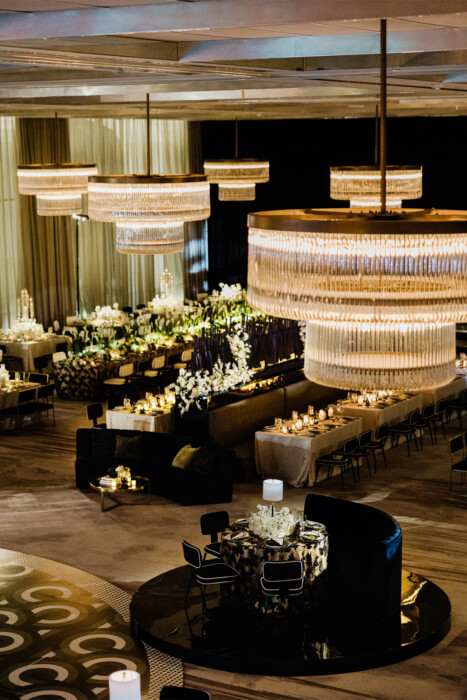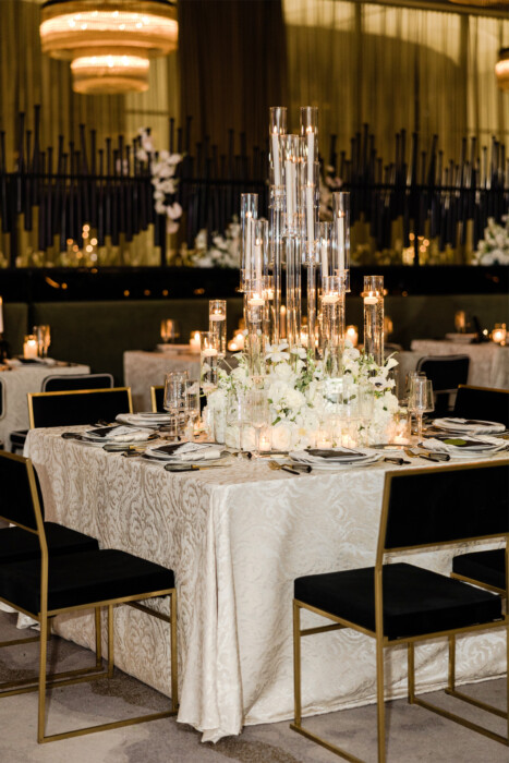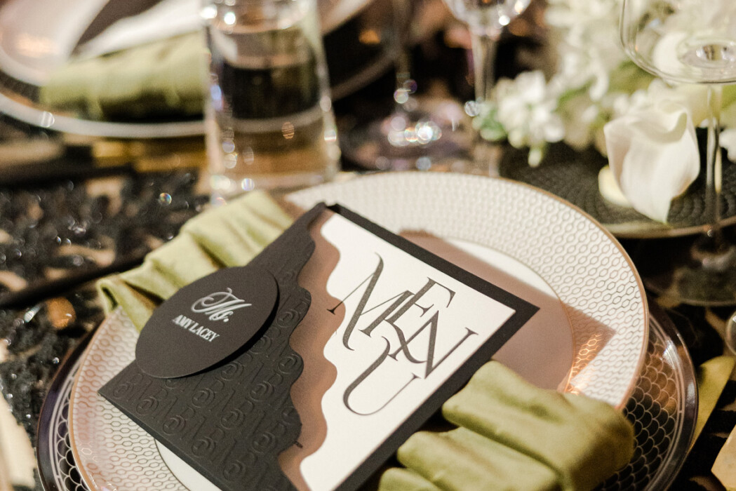 Leslie incorporated subtle nods to baseball—from seating assignments presented in the form of custom trading cards (created by Irving-based Panini America) to black bats used en masse as a decorative element. “Maggie didn’t want it to be the theme,” Leslie remembers. “So my goal was to bring in those elements without it being loud.”