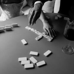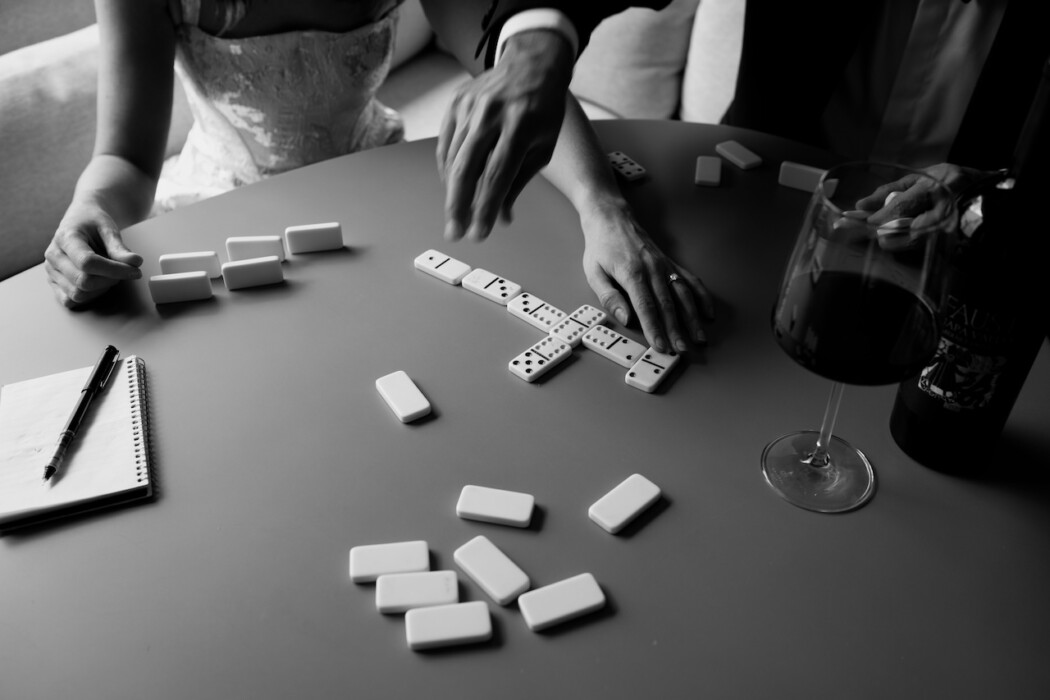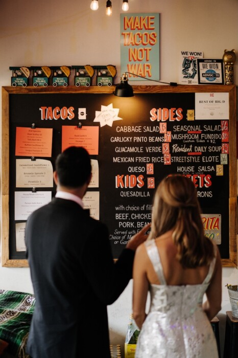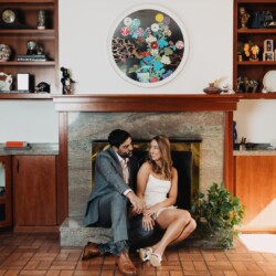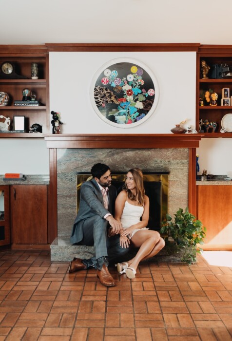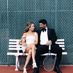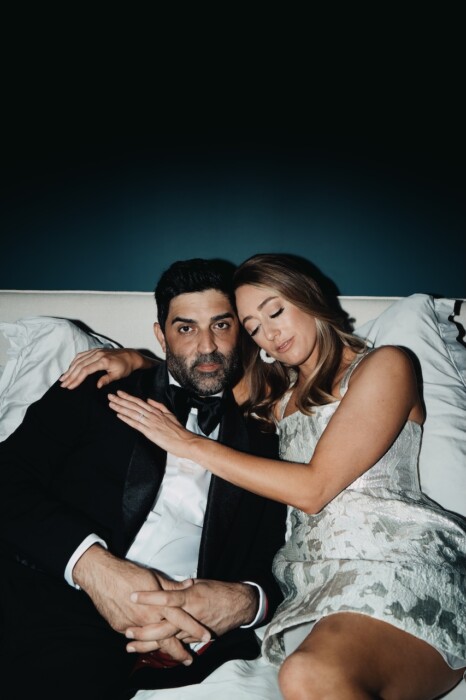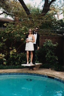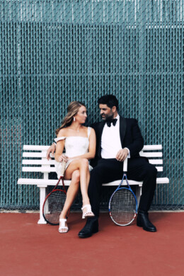 In planning every detail of their highly personalized November 2024 wedding—from their floral design to their engagement photos—Caitlin Clark and Christian Yazdanpanah intentionally zigged where others zag. “I was really waffling on even doing engagement photos,” says Caitlin, who is the online executive editor for D Magazine, adding in jest, “There aren’t any fields in Dallas I really connect with!” Luckily, her fiance had a vision. “I had a concept of elevating our daily routines into sophisticated candid shots,” says Christian, citing images of Old Hollywood icons as inspiration. The couple eschewed more typical settings in favor of their Lake Highlands neighborhood, capturing artful yet tongue-in-cheek portraits in their natural habitats—their favorite taco joint, the high school tennis courts, and their own backyard—while dressed to the nines. Says Christian: “We wanted our photos to remind us that even the most mundane days can feel glamorous when you spend them with someone you love.”