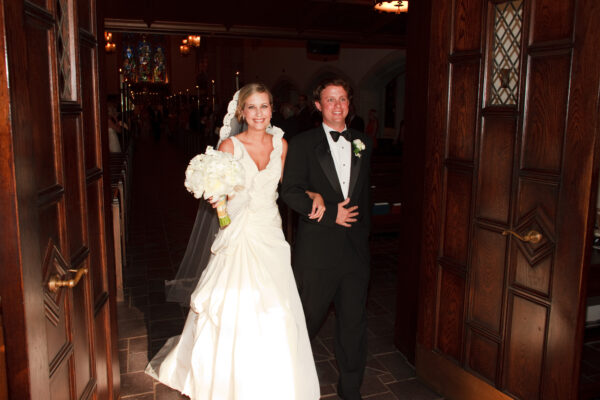 Ryan remembers the morning of the wedding fondly. “The moments before walking down the aisle were made so much more relaxing by being surrounded by my wedding party, friends I’ve had for many, many years! I really wasn’t all that nervous in the hours leading up to the ceremony,” she says. “Doug and I chose not to see each other until the chapel doors opened. Her bridesmaids’ looks were current and complemented the floral. “Strapless dresses were the trend nine years ago, so my ‘maids wore gold gowns to accent the pink peonies. I chose an all white bouquet, and we wrapped my grandmother’s blue rosary around the bouquet as a tribute to her.”