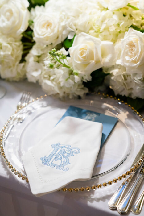 As any good Southern girl knows, there’s no such thing as too much embroidery—we slap our monograms on pillows, towels, handbags…you name it. The same holds true for your wedding day. (Did you know: When incorporating both your and your beloved’s initials, the correct term is duogram!) If there’s empty space, personalize it—with your family crest, wedding date, or something even more precious. “One of the most memorable items I’ve done was handkerchiefs for a bride and father of the bride bearing the signature of the bride’s mom, who had recently passed away,” recalls Becca Quisenberry of The Monogram Club (who kindly created our headline above). Quisenberry specializes in adding tasteful touches—“it should add value but not overtake it,” she advises—to anything from masks and cocktail napkins to bridal party PJs or the cuffs of a groom’s shirt. “Embroidery can transform an ordinary object into something extraordinary—an instant heirloom that will give deeper meaning to your celebration,” she says.