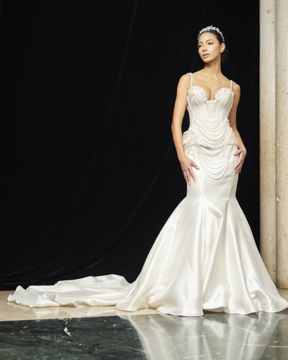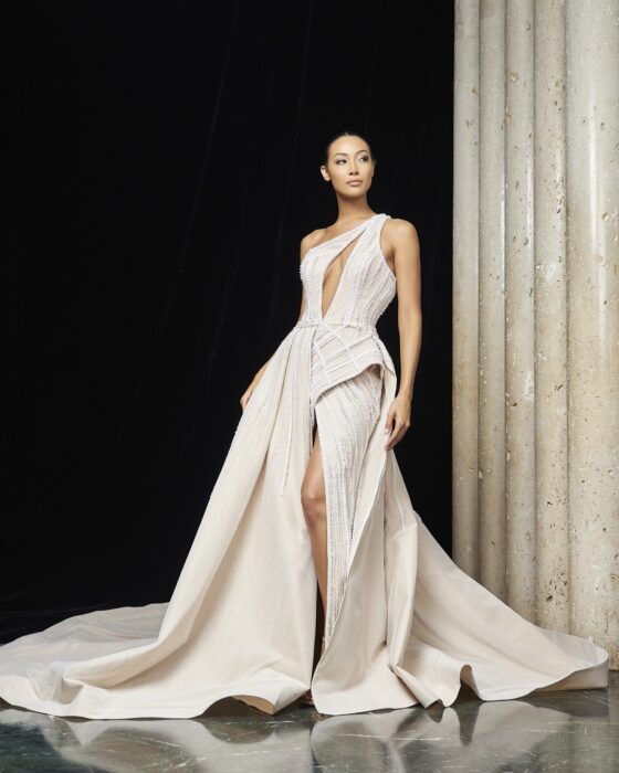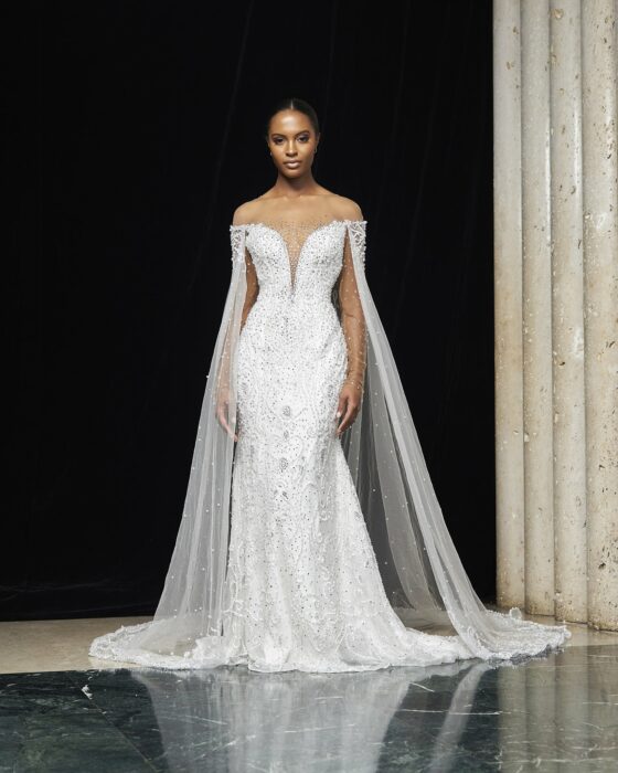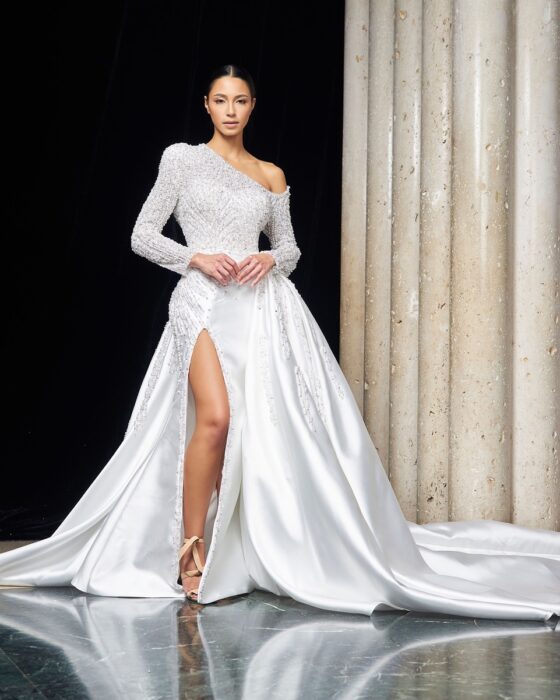 Each bride who works with Azénabor receives a custom gown tailored to their exact measurements and likings. The design can be one from her collections, which they can see and try on in her showroom. She also offers bespoke services, where she works with a bride to custom design their perfect gown.