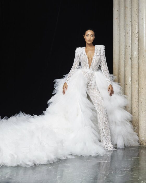 She does just that in her latest “Dream Collection.” Think heavy beading, full skirts, lace appliqués, and structured lines. From a blazer-style dress to two-in-one pieces for optimal reception partying, her latest collection is perfect for the strong woman who still wants to feel whimsical and light on her wedding day.