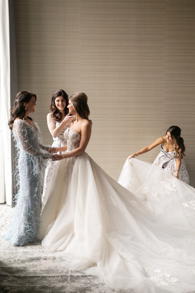 With the help of her mother and bridesmaids, Brighton Keller prepares to walk down the aisle from her bridal suite at the Omni Barton Creek Resort & Spa. Matt Shelley of John Cain Photography says a serene (and photogenic) space for getting ready should be on your checklist when scouting venues. “It’s important to have a space to feel at ease and connected to your loved ones without distraction,” he says. Be sure to check out the available spaces at your venue, or find a photo-worthy hotel room or corner of your home in which to take pre-ceremony shots.