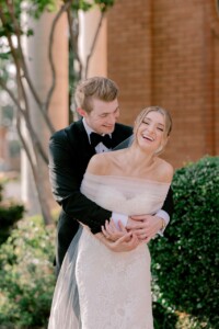 Lauren: Joe and I met in college at Texas A&M University. Soon after meeting, we started dating, and I quickly knew Joe was my person. When he proposed, he disguised it as a gala that we had been invited to with his family. He even planted stories to make sure I would suspect nothing of the proposal, which including looping his beloved family dog into the plot. When the day came, he picked me up for the “gala” but stopped at a trail close to his house, just the two of us; got on one knee; and popped the question. Afterwards, we spent the night celebrating at an engagement party with our closest friends and family.