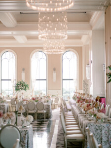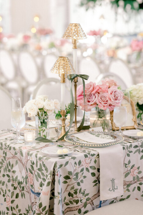 Lauren: We tried to focus on creating an evening that felt deeply intimate and unique to Joe and I. The tablecloths, pillows, and all the guests’ napkins were custom made to match the wallpaper we had chosen. Each color in the fabric and wallpaper was matched to complement the ballroom and highlight its gorgeous features.