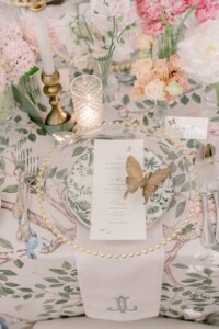 Lauren: The customization of our decor is what made the reception so special to us! The tables themselves were a visual feast, draped in chinoiserie tablecloths that had been color matched to the ballroom walls and flooring. They were scattered with brass birds, butterflies, and dragonflies placed to add a whimsical touch.