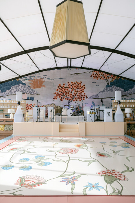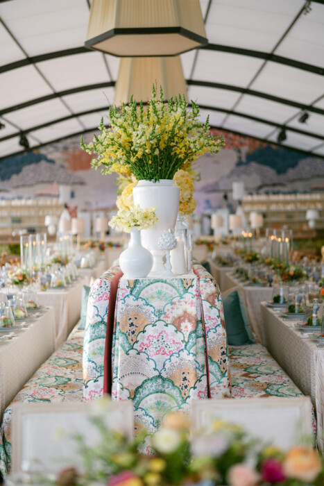 With the location locked in, Clara worked with event planner Michelle Rago and designer Todd Fiscus to marry her love of pattern play with the lay of the land. “All the nature and wildflowers and architecture helped build the vibe,” Clara says. “Todd did a great job of balancing those elements with my love for chinoiserie.”