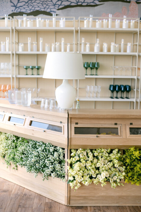 Guests were encouraged to belly up to custom bars crafted from grain cabinets, which were then filled with flowers and outfitted with elegant lamps. “Bars feel sexier with a little light,” says Todd, who notes that the white glass “made it feel Western ranch dime store gone five-star experience.”