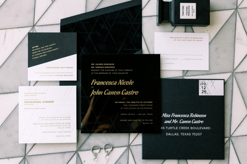 After meeting their first week of college at the University of Arkansas, Francesca Robinson and Canon Castro went on a lunch date. “That day, we went to lunch—and then every day after that,” says Francesca. They dated for five years before Canon proposed at his family’s winery in Rockwall. The creative couple—she’s an interior designer; he’s an architect—planned an artful affair inspired by the visuals of Old Hollywood, complete with a runway-style ceremony procession on a black-and-white checkered aisle. And in true red-carpet fashion, Francesca planned three outfit changes and one dramatic hair transformation—chopping her long locks into a fashionable bob. “Everything was beyond perfect,” she says. “It was the best night of our lives.”