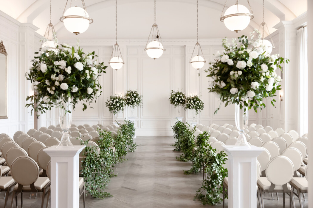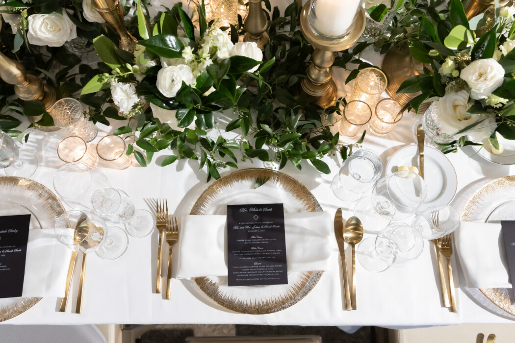 From the first design moment, Sarah wanted a black-and-white checkered dance floor with oodles of white flowers and lush greenery. The tables were decked out with gold tableware, glass chargers with gold rims, classic white table linens, and black linen personalized menus setting the tone for a classic, elegant celebration. One of Sarah’s favorite experiences was having guests leave a personalized message on a classic 1950s Princess phone!