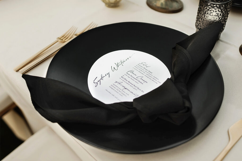 The black-and-white color palette was a non-comprisable aspect for Amanda. “I wanted to make it so simple and classic, so I could look back on my photos and still have it look good,” Amanda says. Black chargers topped with white round menu cards were designed to resemble a record.