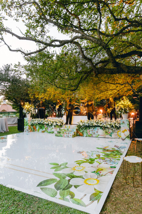 Don’t settle for cookie-cutter decor! Every surface is an opportunity to add your own flair. Take, for instance, the leaf-accented ghost chairs (decals designed by Pop Parties, executed by Shag Carpet); botanical bandstands (designed by Katherine Jezek Designs in partnership with Pop Parties); and custom dance floor and stage wrap (designed by Color Box Letterpress, created by Center Stage Floors) below.