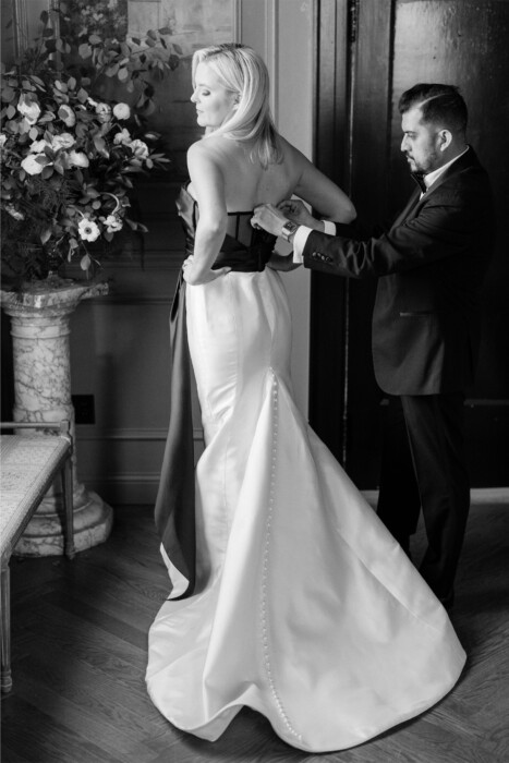After trying on many gowns and having no luck, Cassie finally found “the one” at Bergdorf Goodman in New York City. “I’m always in black, so when I walked into Bergdorf’s, I found this Marchesa dress with a black bodice and an architectural grand bow, and it felt elegant and elevated and perfect for New Year’s Eve,” she says. She added pearl details to the train, which was a sweet wink to a phrase the couple often say to one another: “The world is your oyster, and you are my pearl.”