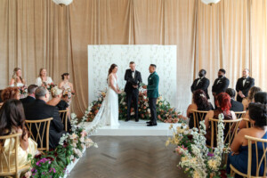 At a time when College Station, Texas, was lacking many vegan dining options, the only place Taylor Mullahy could get a decent vegan burger was the Hopdoddy where Javier Perez bartended. Repeat encounters led to grabbing a drink after his shift, and in 2022, Javier proposed on their fourth anniversary. It was “the worst day in October you could imagine,” Taylor remembers with a laugh, but under heavy rain, Javier got down on one knee in front of marquee letters spelling “Marry me.” The self-described indecisive bride leaned on Alexa Kay Events to fine-tune her vision of a wedding that was “soft but not boring,” eventually deciding on The Adolphus as its backdrop. There, the couple hosted an intimate celebration that turned out just as Taylor had imagined.