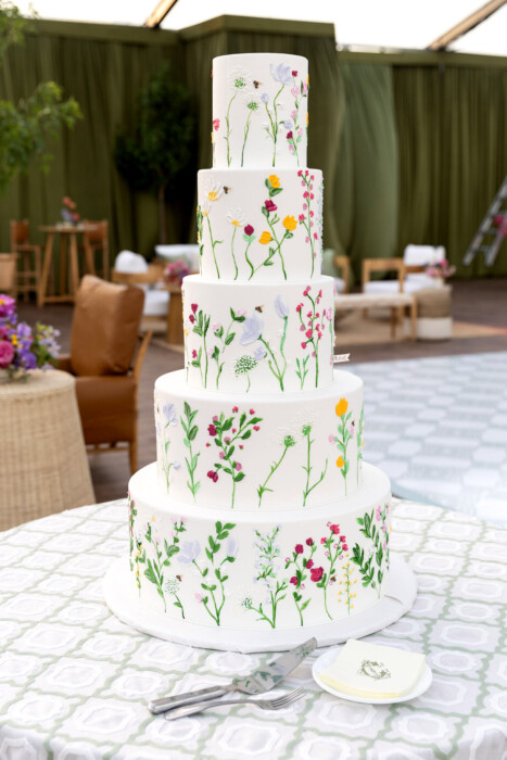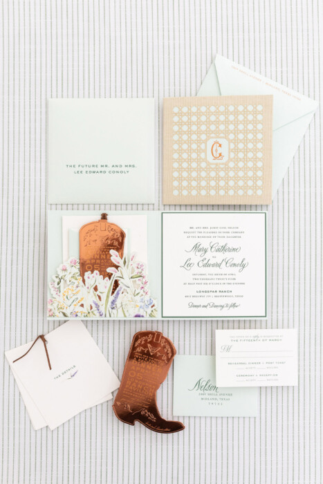 When designing her invitation suite, Catherine drew on shades of blue and green to echo the natural beauty that would inspire the whole event. But the rehearsal dinner invitation got a pop of whimsy in the shape of a boot. “We really just wanted something fun and different,” she says.