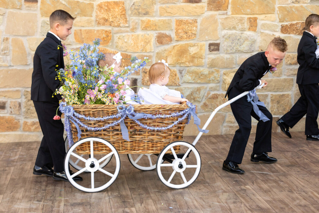 The couple’s nieces served as flower girls, with the youngest ones hitching a ride in a rattan wagon, which was pulled by the couple’s nephews.