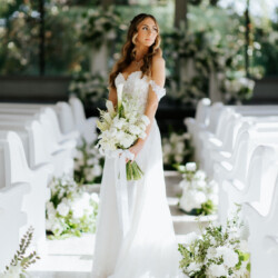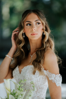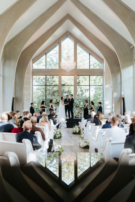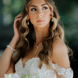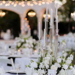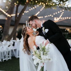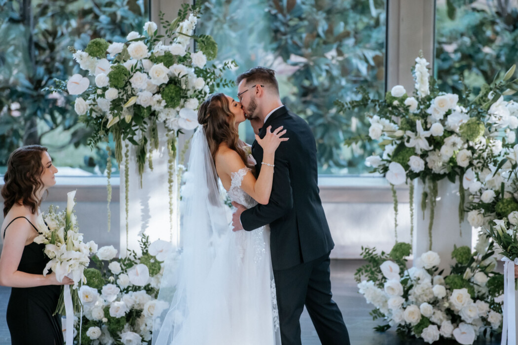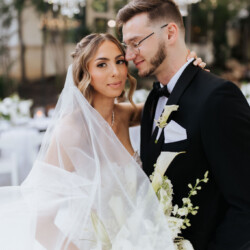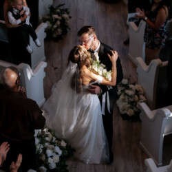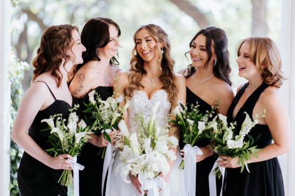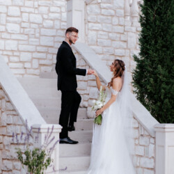 The wedding’s dramatic black-and-white color palette set a sophisticated tone. Boujee Bloom brought the vision to life with exquisite florals — cascading orchids, calla lilies, and roses accented by lush green hydrangeas and sparkling chandeliers. Lindsey stunned in a Justin Alexander gown, her classic bridal elegance mirrored by the venue’s natural light and romantic stone architecture.