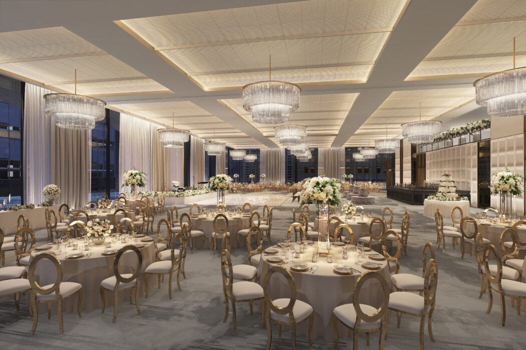 Essentials include 219 rooms with 52 suites; three full-service offerings for dining and drink; a boutique spa and fitness experience focused on wellness; a variety of spaces for events, including the ~14,000 square foot National Ballroom; plus stunning skyline views from the ~2-acre indoor/outdoor 9th-floor pool deck.