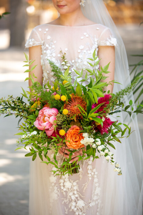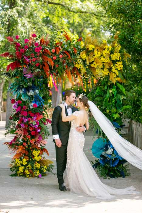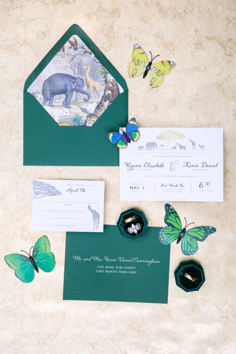 Danny quickly suggested the Fort Worth Zoo for their wedding venue—perfect for the beekeeper bride and her nature-loving groom. Once the venue fell into place, Ryann started envisioning what she wished for her wedding to look like. Her vision turned out to be so strong, in fact, that she opted out of hiring a wedding planner. She got to work designing a vibrant, lively gathering full of richly colorful touches that was a true reflection of her and Danny as a couple. “Not only was I marrying the love of my life,” says Ryann of their May 7, 2022, celebration, “but I got to look around and see the space that I put so much love into.”