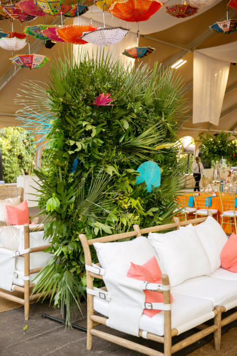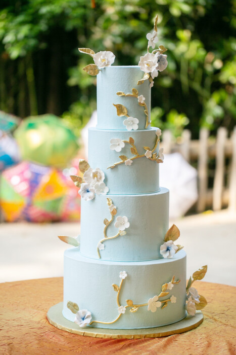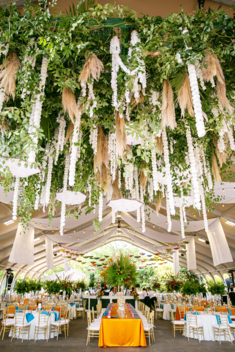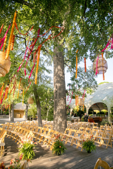 While Ryann appreciates the classic quality of an all-white wedding, she knew from the beginning that she preferred a different style—a bright, colorful affair that she says reflected her and Danny as a couple. “I wanted the wedding to be fun, vibrant, and different,” she says. The zoo’s grove was decorated with rattan lanterns and flower garlands of marigolds, carnations, and daisies.