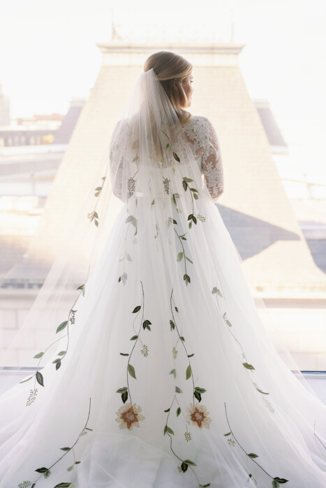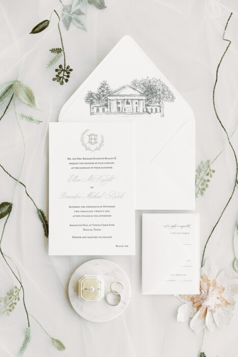 No trees were harmed in the making of then-coworkers Ellie Bullitt and Brandon Rawls’ love story. Well, maybe a few. “He sat right near the printer, and I’d use any excuse I could to print out long documents,” she says. After 3.5 years of dating, Brandon got down on one knee at sunset and surprised Ellie with a gathering of their best friends and family. Ten months later on November 13, 2021, they wed at Arlington Hall under an arch of artfully overgrown flowers. “We wanted to make sure the wedding was something that felt like both me and Brandon—not just me,” she says. The result was a stunning evening that was romantic and whimsical with a touch of inspiration from The Secret Garden.