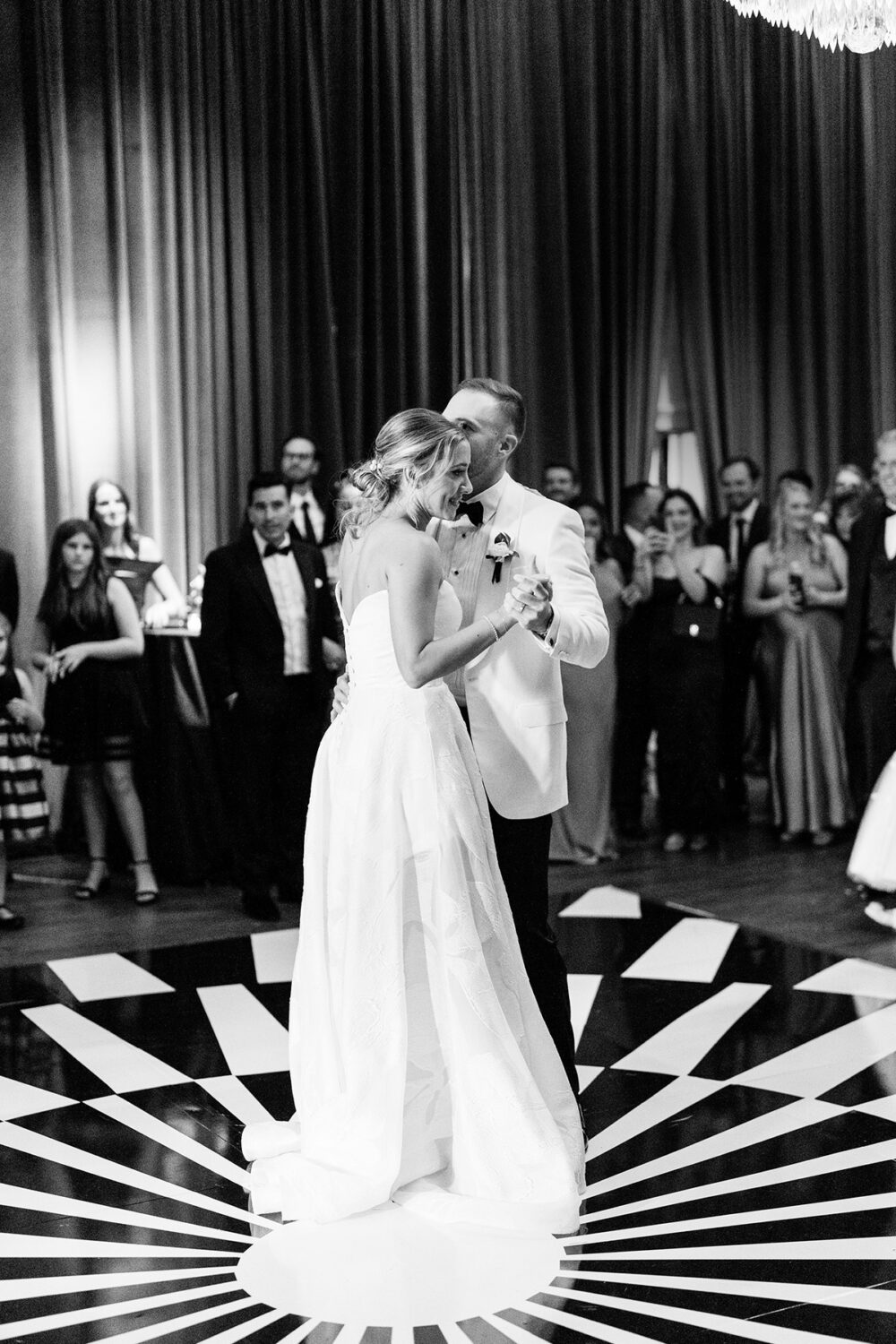 Kelsey Miller wanted the dance portion of her and Casey Lofton’s October 22, 2022, Arlington Hall wedding to have the feel of an upscale club. “She loved the look of a black-and-white checkered dance floor but wanted something a bit more interesting,” says Rielly Kidwell of House of CLRK by Emily Clarke. The team came up with this spiral design, which was brought to life by Center Stage Floors.