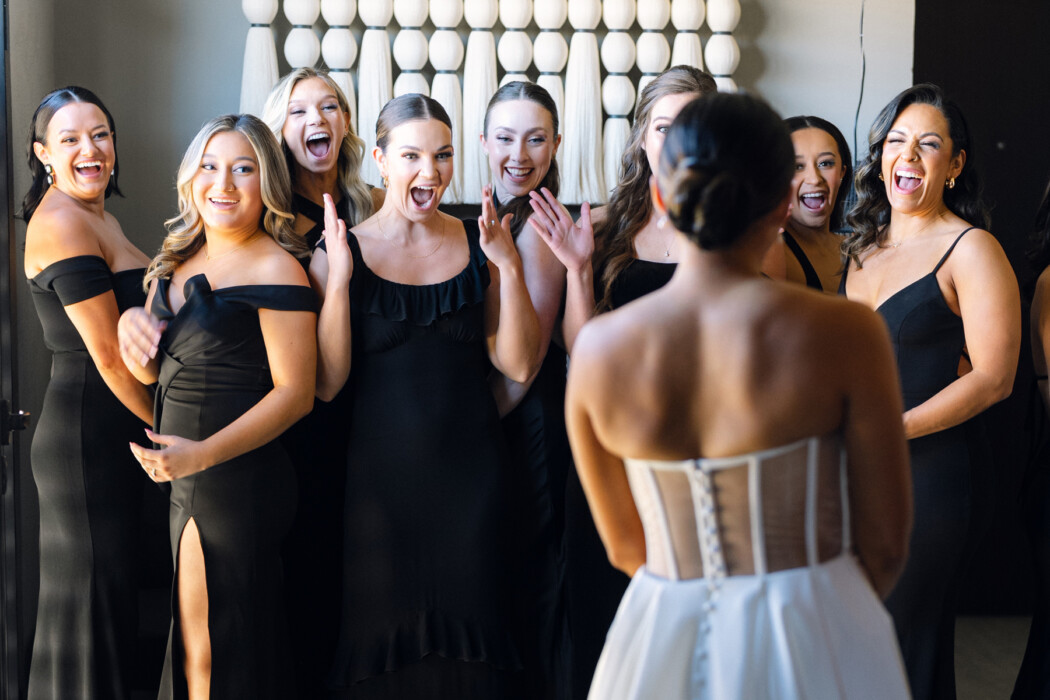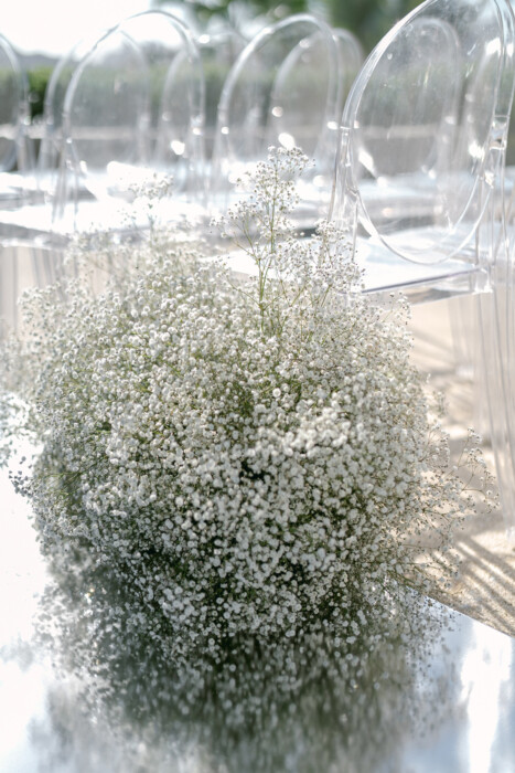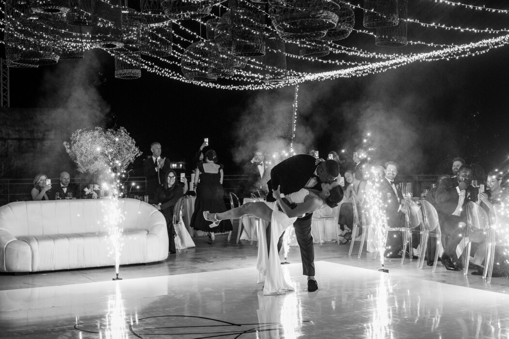 The destination wedding took place on The Cape’s outdoor property. “My vision for the wedding was very clean,” Victoria says. “I wanted the ocean, the arches, and the sunset to be the focus, so we chose black and white as the colors.” The minimalist look was completed with ghost chairs, a mirrored aisle, and a 15-foot arch of baby’s breath framing the altar, all of which added drama without detracting from the natural scenery. “It was very wow,” says the bride.