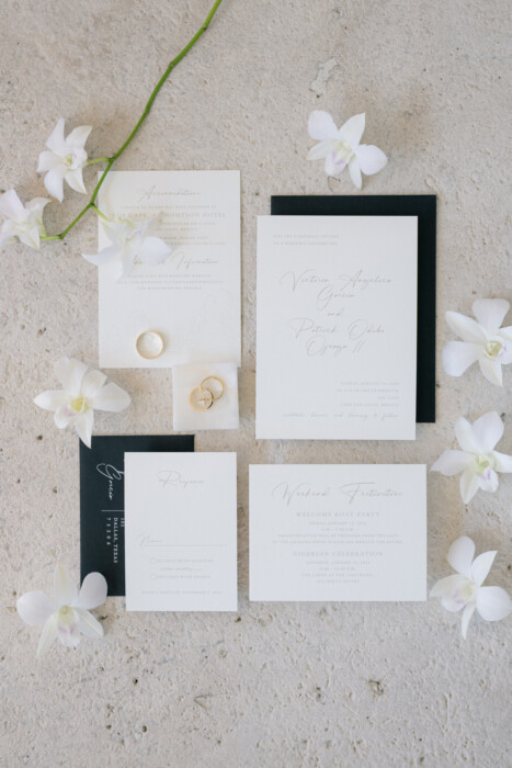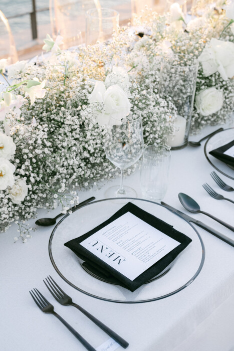 The dinner tables were lined with baby’s breath arrangements, and the menus and place settings stuck to the monochromatic hues. “We focused on a modern, minimalist palettewith dramatic touches of ebony and sand,” says planner Karli Spangler. “Our goal was to highlight the natural surroundings of sea, salt, and sky by way of modern, clean lines and neutral tones.”