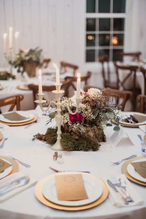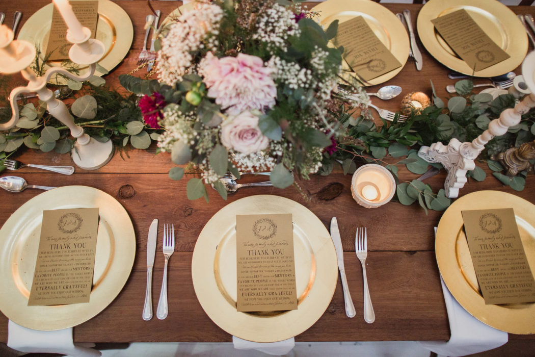 Abbe Weatherford and Jordan Laessig may have dated for five years, but their engagement spanned only five months. They quickly started planning and booked rustic barn The White Sparrow before it was even completed. On July 18, 2015, Abbe’s vision of a “romantic, soft, and a little bit magical” wedding came to life with antique pieces, candles, gilded accents, and lush greenery. “I wanted my guests to walk in and say, ‘Wow,’” she says.