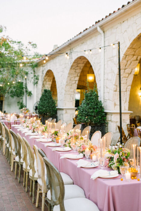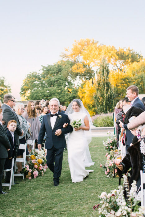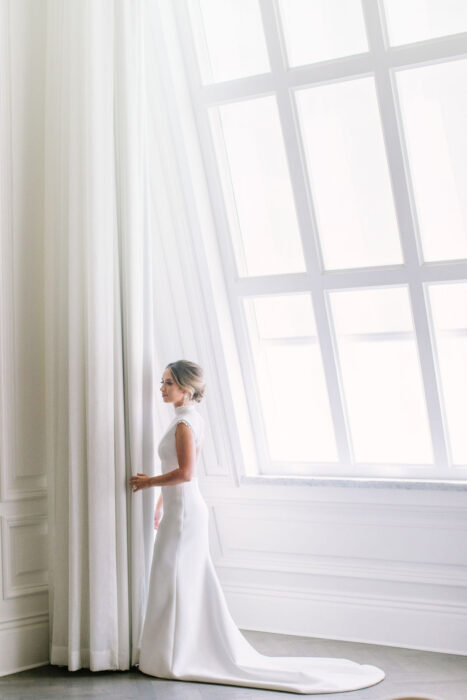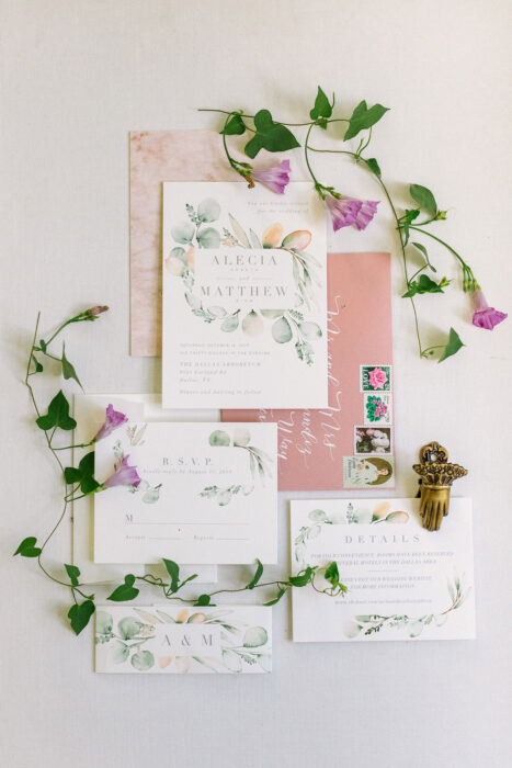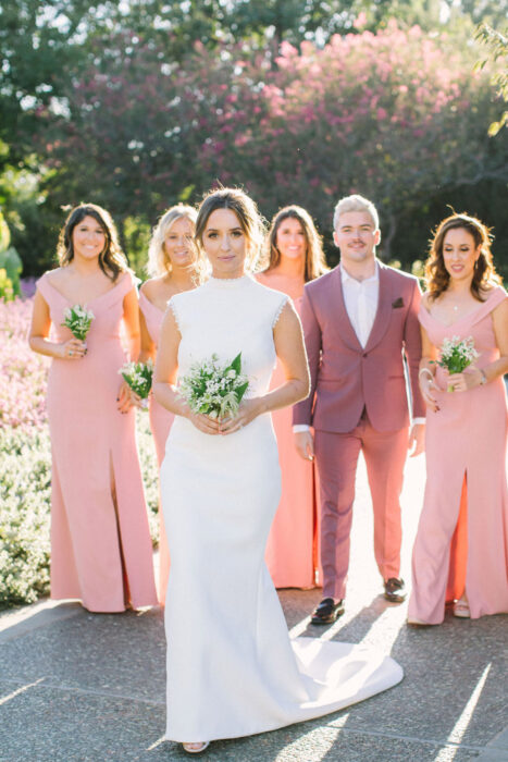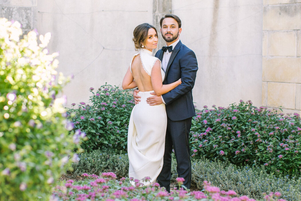Alecia and her bridal party got ready for the day at the Adolphus Hotel. Before heading to the Arboretum, Matthew met her at the hotel’s Century Room for portraits. This gave Alecia extra time to relax indoors and touch up hair and makeup, while also getting a second setting in her photos. For couples wanting to diversify the background of their portraits, planner and designer Lottie Fowler of Grit & Gold Event Co. recommends finding a location you are already getting ready at or that is on the way to the wedding venue to keep these portraits easy. Use of event spaces like the Century Room is of course subject to availability and may incur a fee, so make arrangements with venue management beforehand to ensure your photos go smoothly.