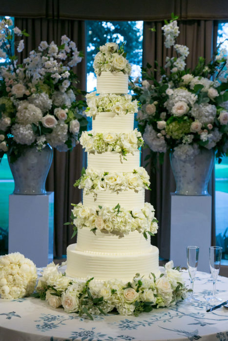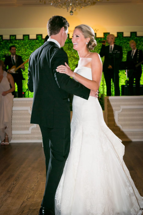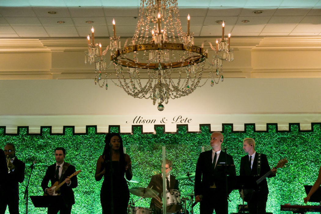 Alison enjoys the outdoors, so they complemented the venue with nature-inspired decor: The band background was a take on a pool cabana, and they completed the set with a boxwood wall. “I love being outside, so I wanted the reception to feel like you were in someone’s amazing backyard.”