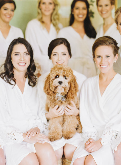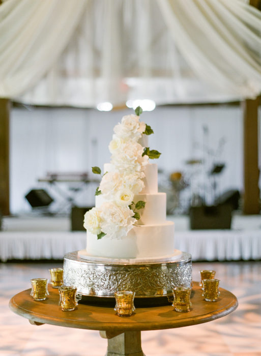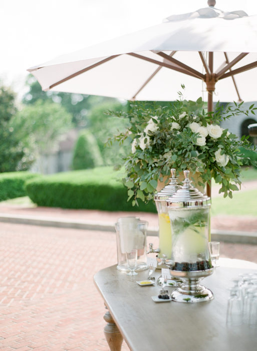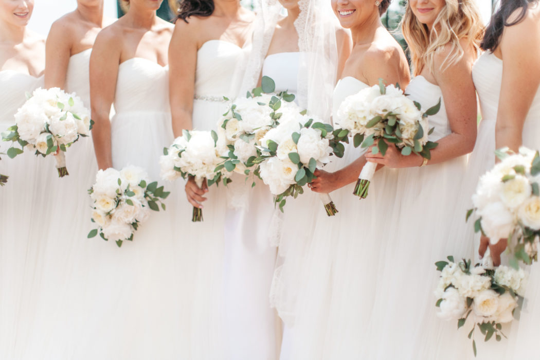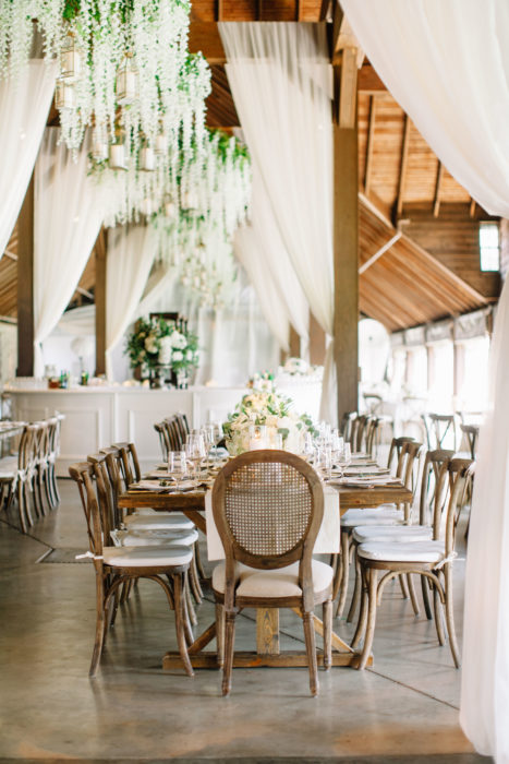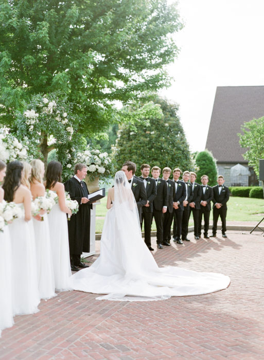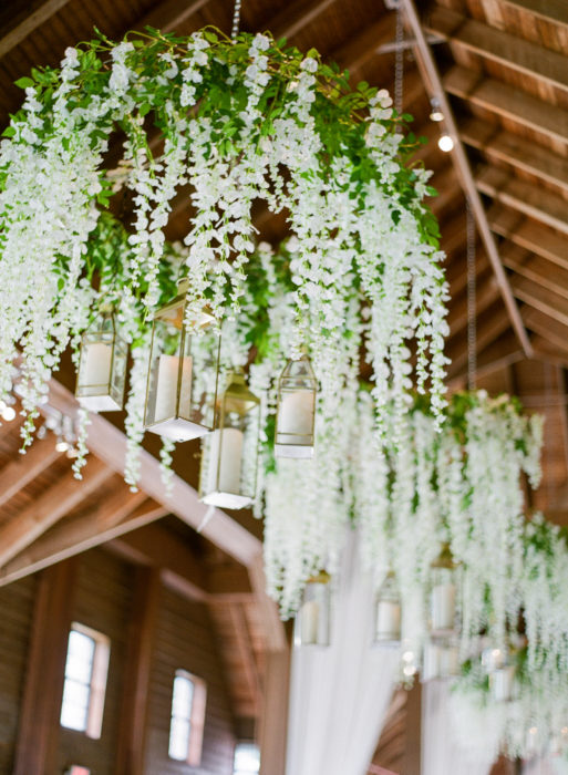 In terms of decor, Ali had a classic Southern wedding in mind. Other than green elements from the scenery and the rustic accents from the Keene Barn where they held their reception, she wanted everything else to be in white, from the flowers hanging from the ceiling to the Jenny Yoo tulle bridesmaid dresses. “I had always joked I wanted it to feel like you walked into heaven,” says Ali.
