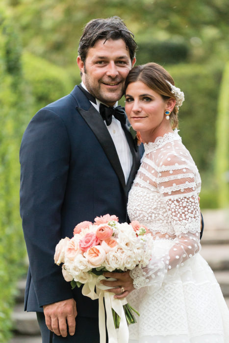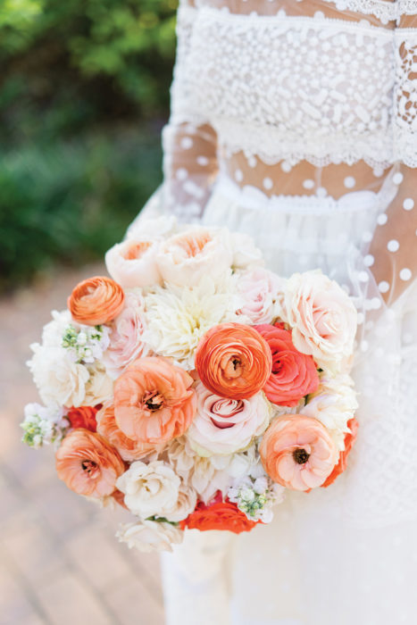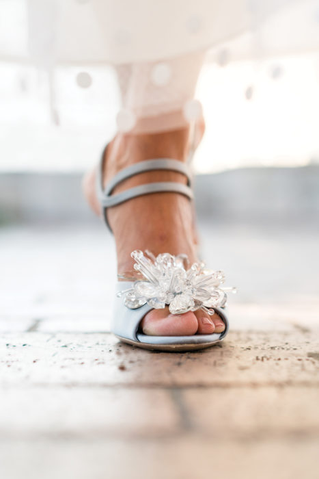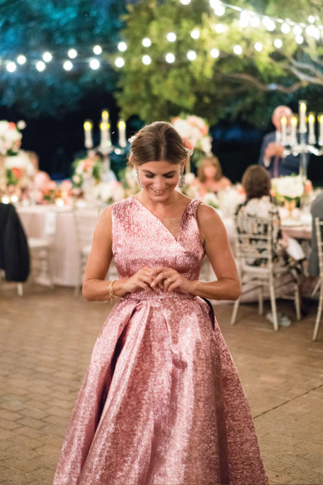 During a trip to Greece, Erica visited many ateliers to get inspiration for her gown. She immediately fell in love with Costarellos, a boutique where all of the dresses are made by hand by a husband-and-wife team. The bride kept them in mind during her wedding planning, and after following them on Instagram, she saw a photo of the perfect dress that was no longer in production. She called the shop, and luckily, they made the dress just for her. The gown fit like a glove, needing no alterations after its arrival, “I was very lucky,” the brides says.