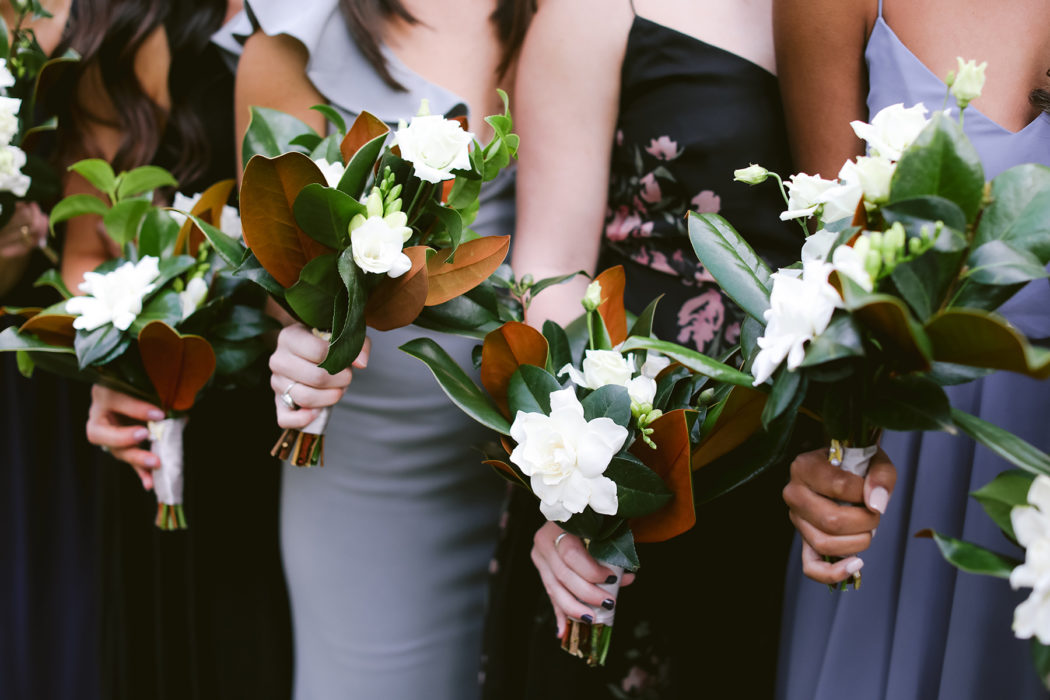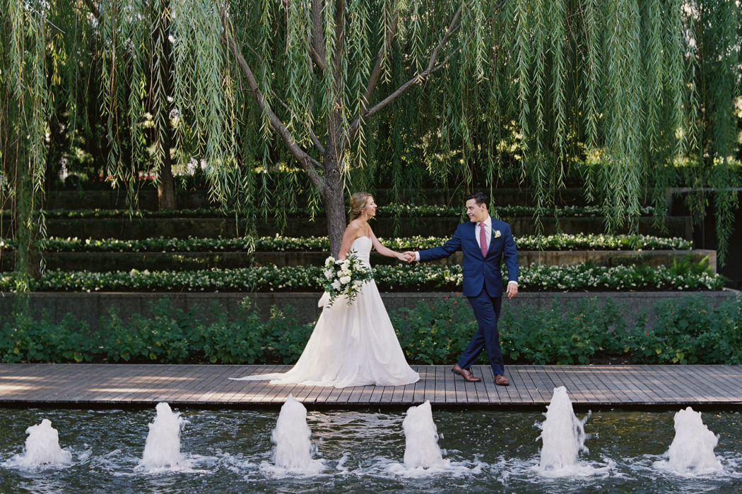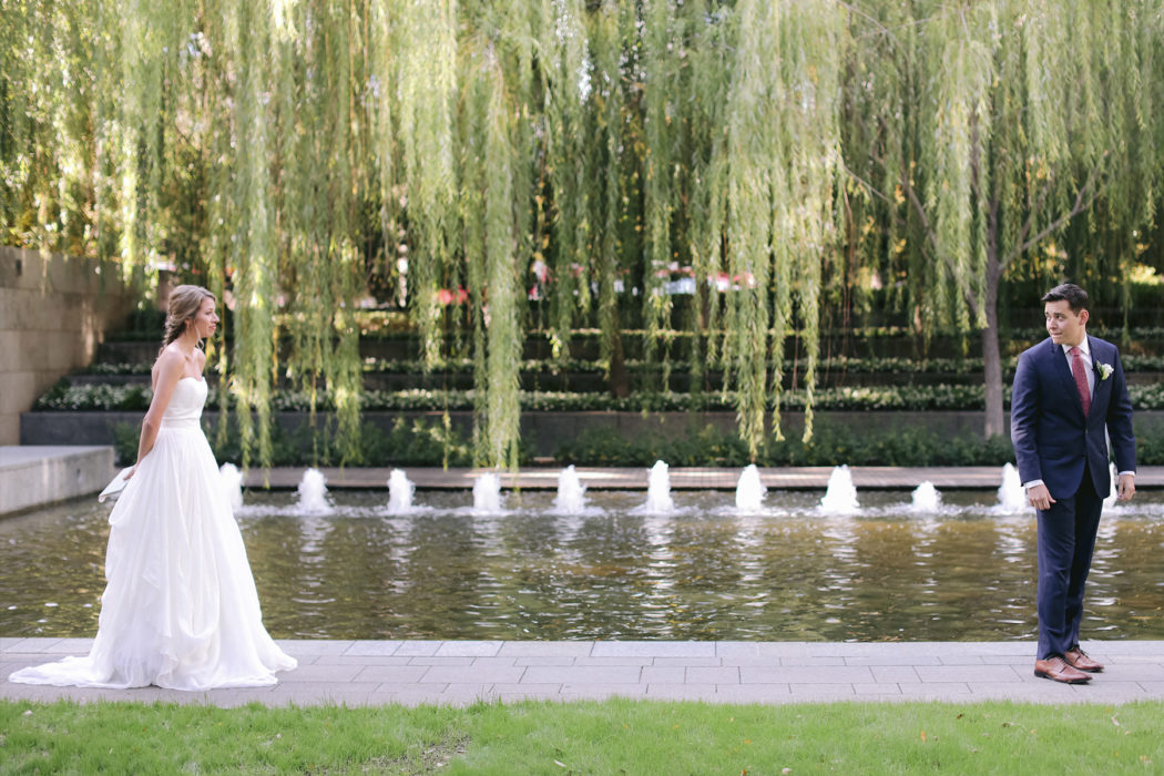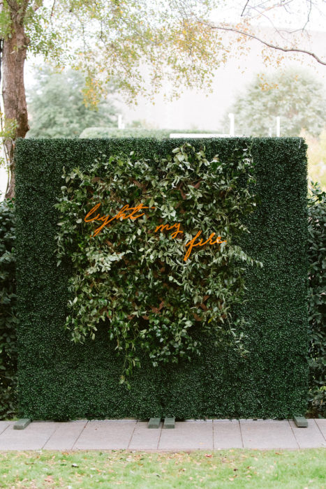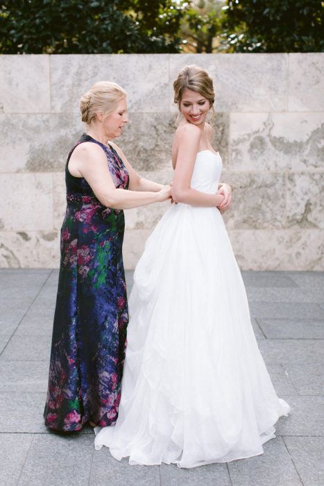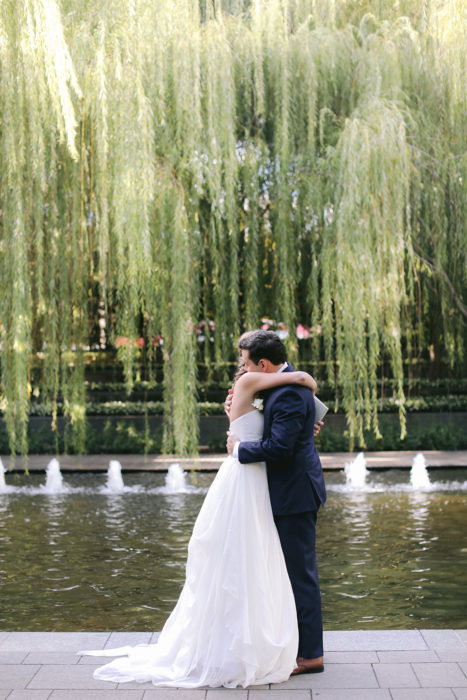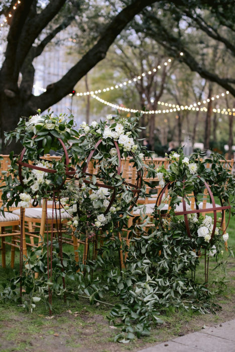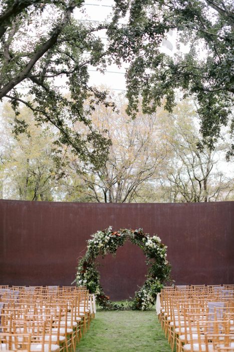 “Anastasia’s unique botanical style called for a one-of-a-kind backdrop for the ceremony,” says florist Katy Roden of Braching Out Events. An eight-foot-tall ring was custom painted to match the Richard Serra sculpture behind it and wrapped it with curly willow branches, wild smilax vine, and magnolia foliage, with touches of white blooms. Says Roden: “The result was simple but stylized—just like our bride!”