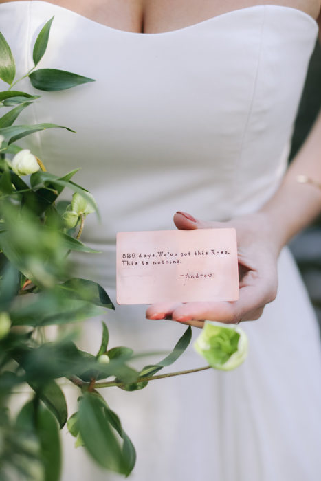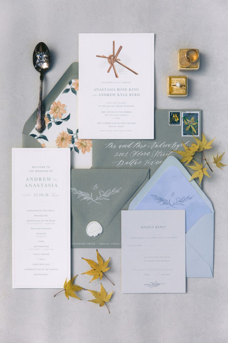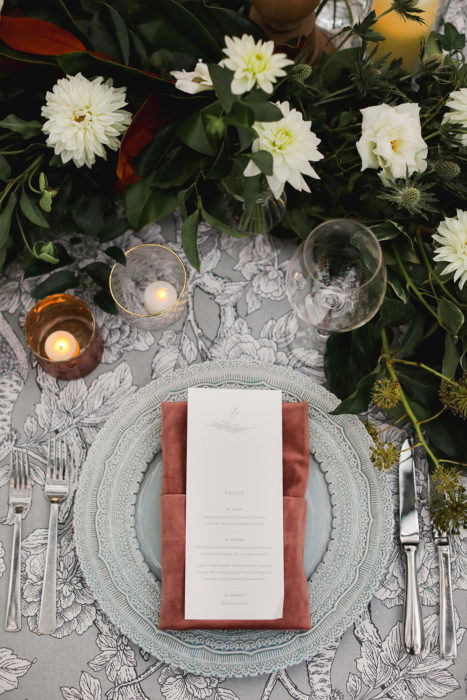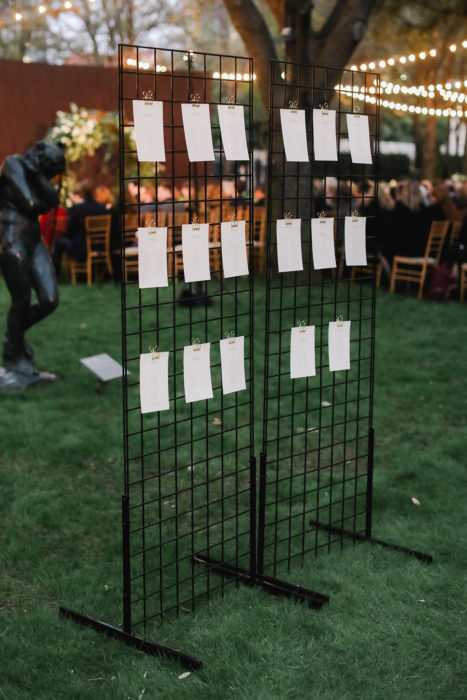 Anastasia worked closely with Sarah Ann Design to create the invitation suite, and it was Anastasia’s idea to include the sculpture on the invitation. “I knew that leaning into the art in the garden and weaving our whole night around each sculpture was something we wanted to do,” she says.