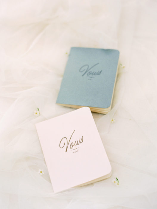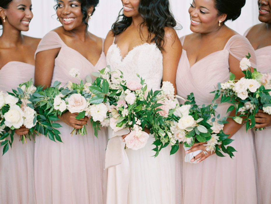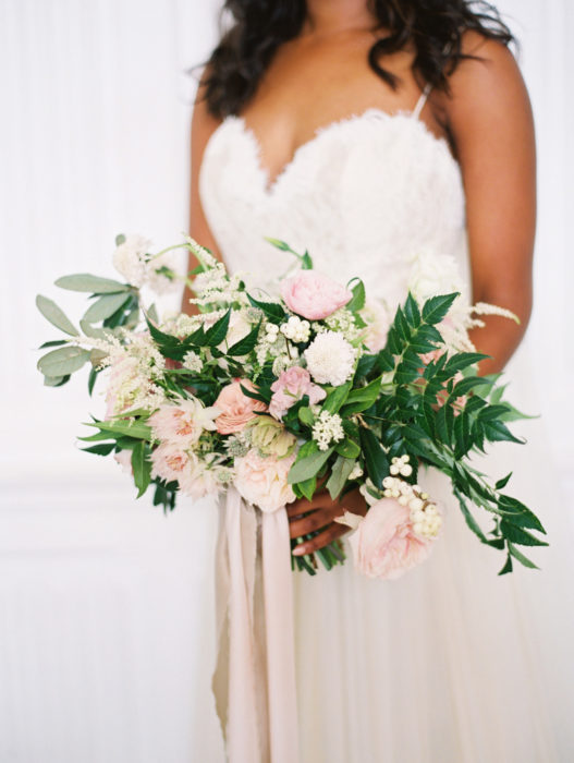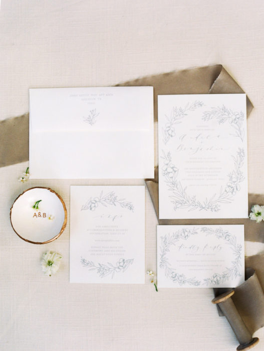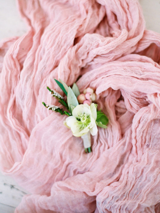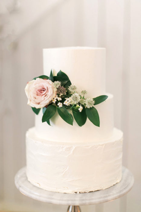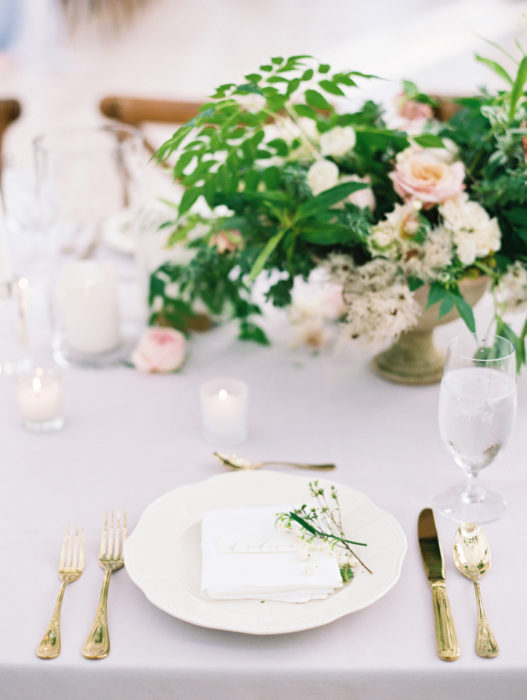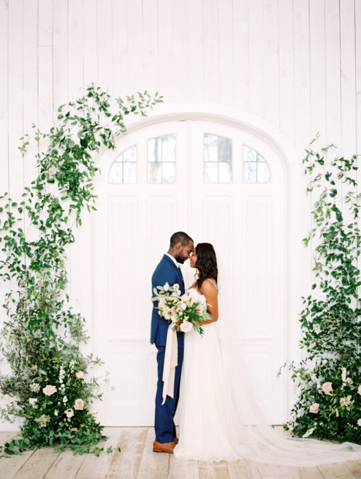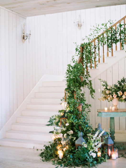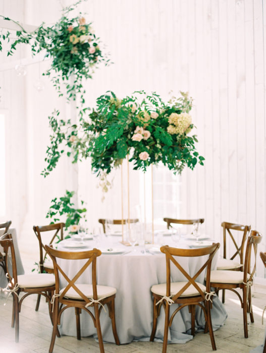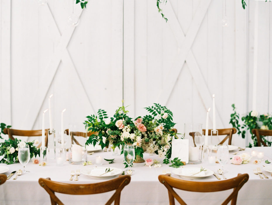 Atlanta-based planners Amy Osaba and Mary Wynn of Amy Osaba Design tapped Andrea’s selected sources for an ethereal celebration. The barn’s sunlit, white wood served as a backdrop for delicate blushes and creams, deep blues, and grays. Ivy framed the doorways and topped light-gray table linens with romantic roses from The Southern Table, and Layered Bake Shop assembled a dessert spread of pink and white confections. “It was a dream,” Andrea says.